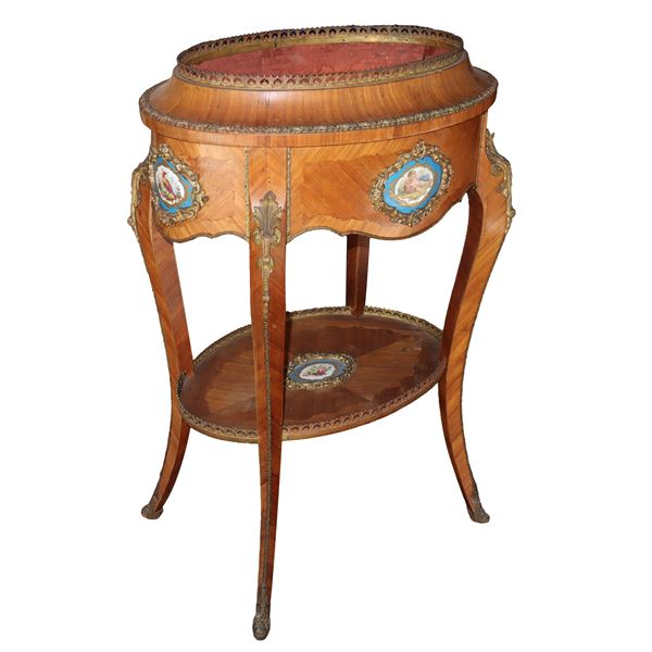 Fioriera in stile Napoleone III, in legno di rosa con porcellane e bronzi applicati, XIX secolo