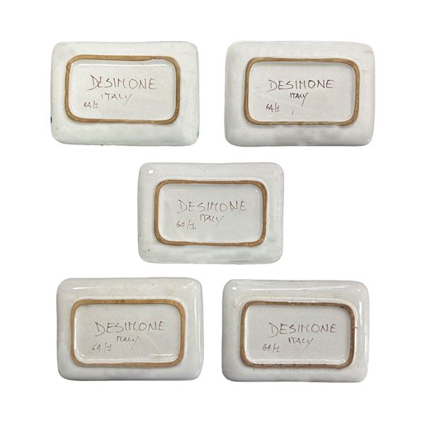 Cinque posaceneri rettangolari in ceramica dipinti a mano, tre raffiguranti un gendarme, uno un fiore, uno un soldato, 1960/1970