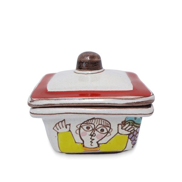 Due ciotoline quadrate in ceramica dipinte a mano con coperchi, decori con uomo, donna e uccellini, 1960/1970