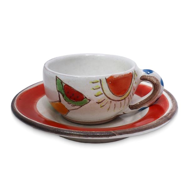 Servizio da caffe' per sette, in ceramica dipinta a mano, motivi vari, 1960/1970