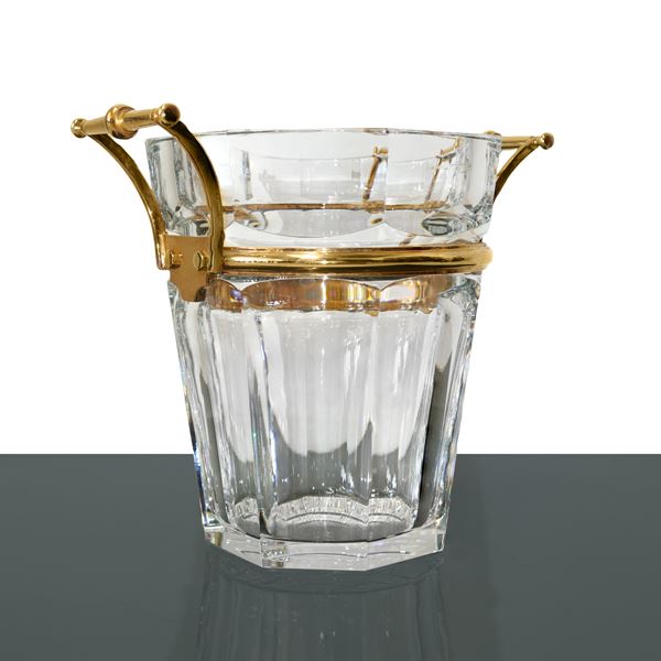 Secchiello porta champagne, collezione Harcourt in cristallo trasparente e metallo dorato, Francia. Anni 80-90