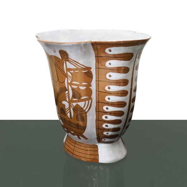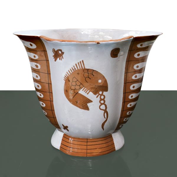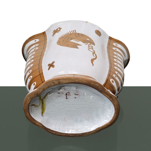 Vaso in ceramica smaltata con raffigurazione di veliero e pesce