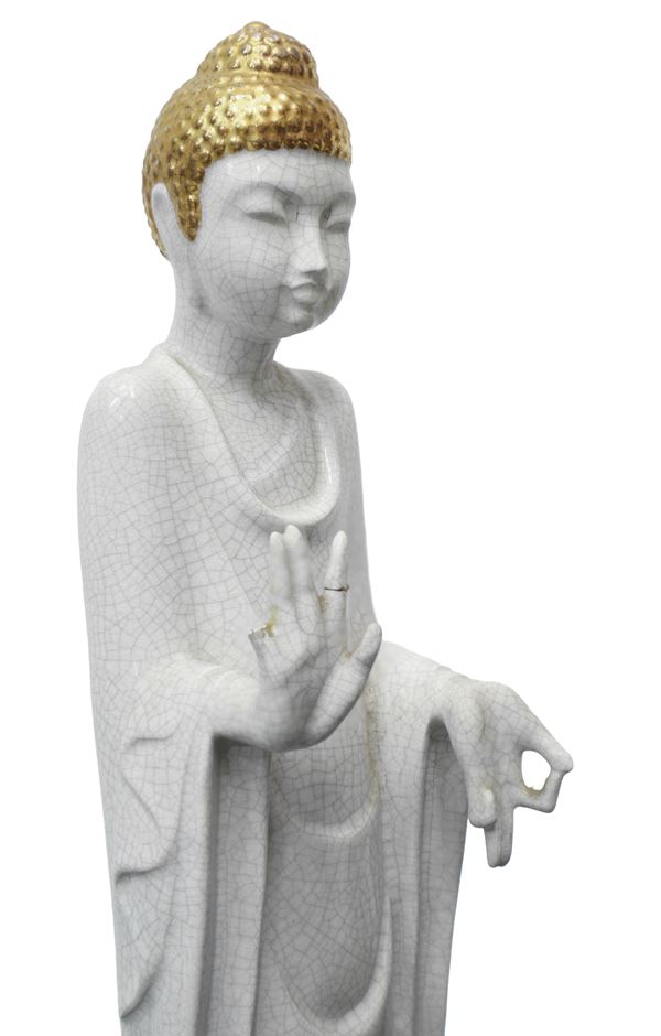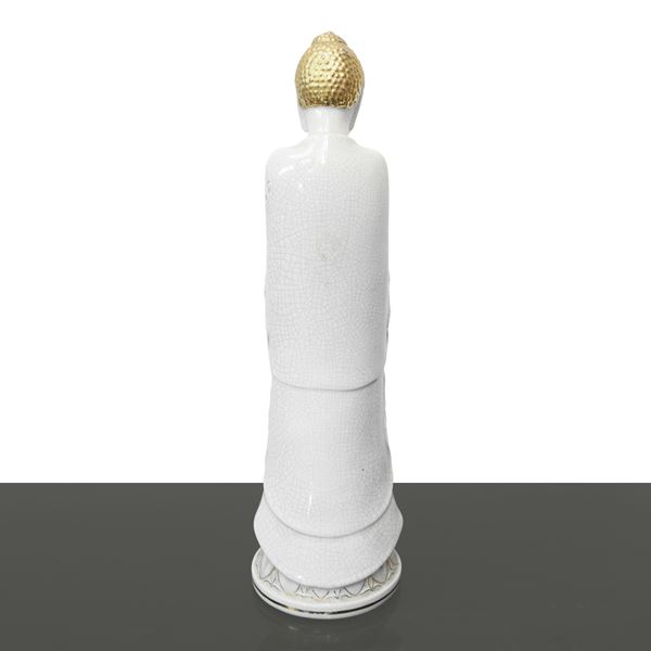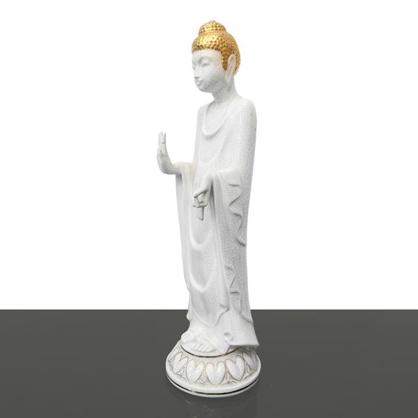 Ceramica a colaggio e smaltata in bianco e con dorature. Manifattura Lenci. Firma sotto la base "Lenci MADE IN ITALY". Dita mancanti e restauri.