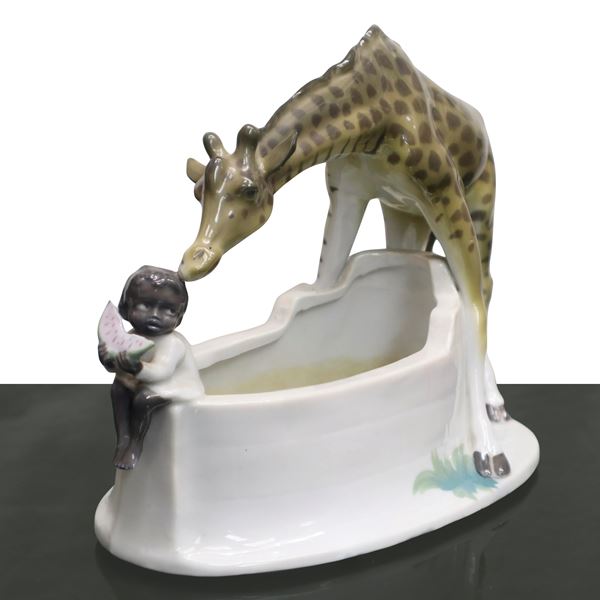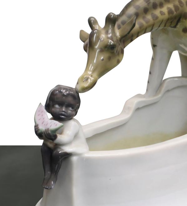 Giraffa con bimbo che mangia l'anguria