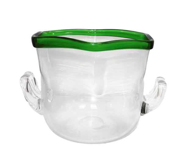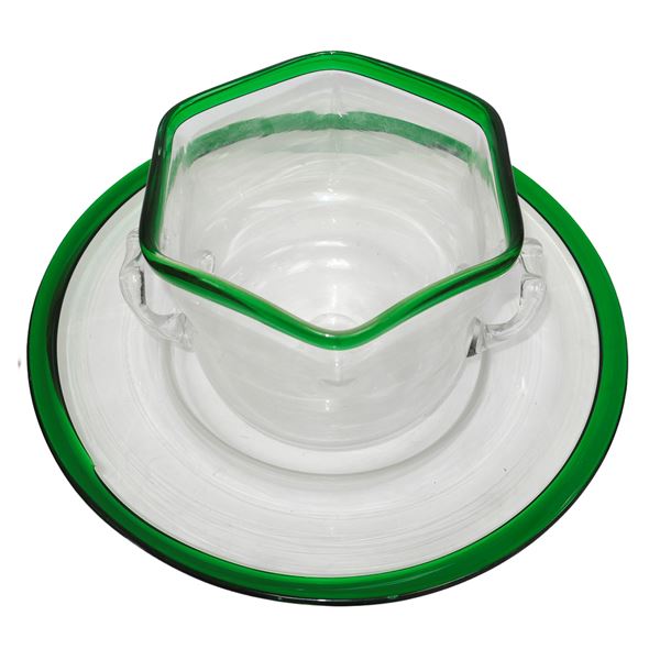 Composto da piatto con vaso in vetro con bocca esagonale e manici,bordo verde