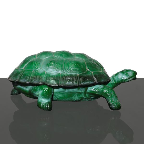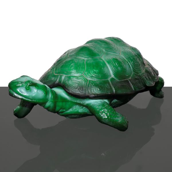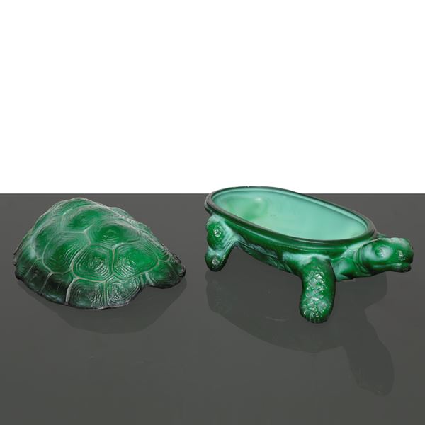 Portagioie Art Deco' a forma di tartaruga in vetro malachite verde, 1930