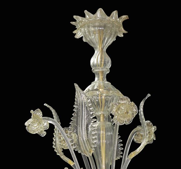 Lampadario a cinque luci in vetro di Murano trasparente con dettagli in oro