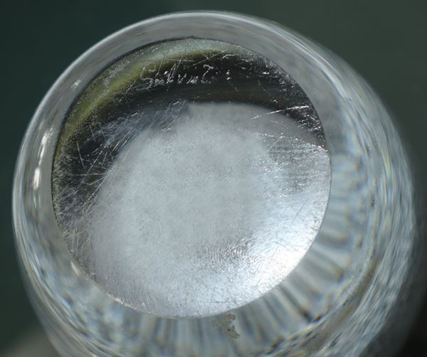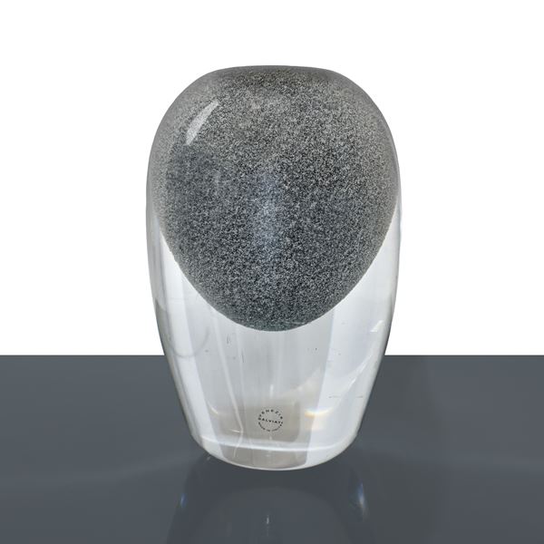Corpo ovalizzato composto da una massa trasparente e da un ovulo nero e argento. Firmato alla base