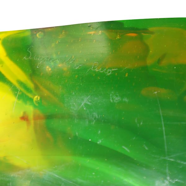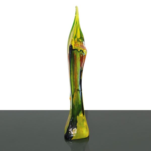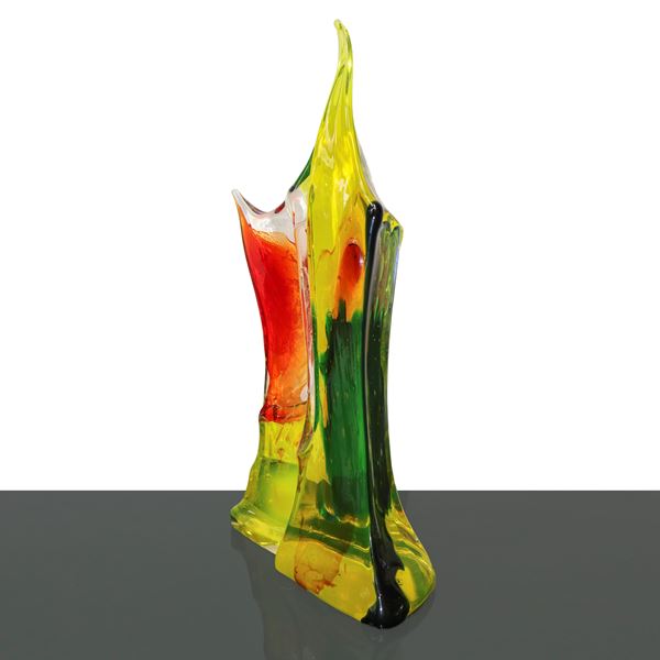 Scultura in vetro di Murano dalla forma astratta nei colori giallo, verde, rosso