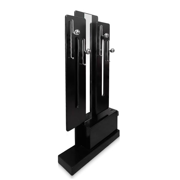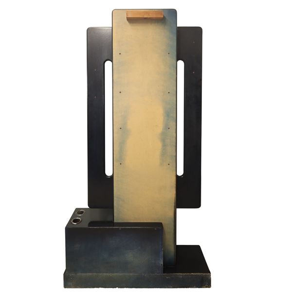 Struttura in legno satinato nero, specchio centrale e staffe cromate, due portaombrelli. Segni d'uso.