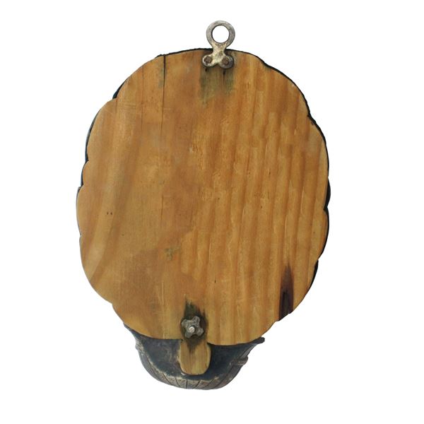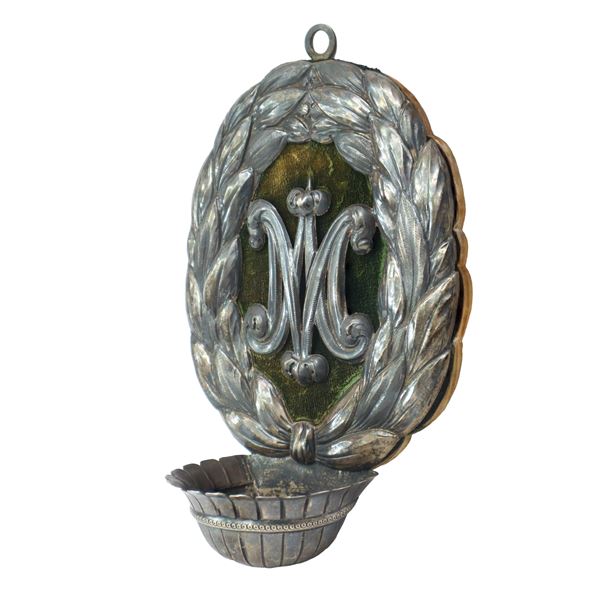 Acquasantiera in argento decoro a foglie intrecciate e Monogramma di Maria