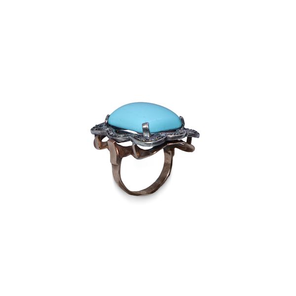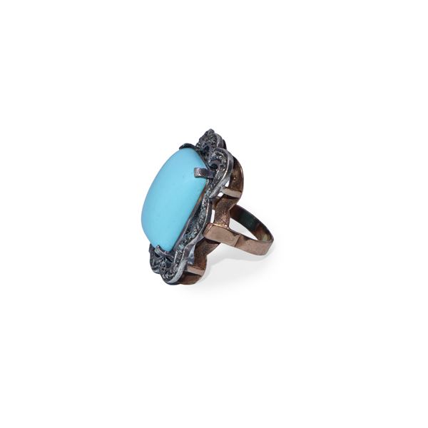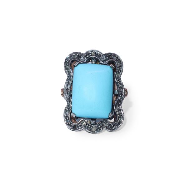 Anello in oro e coppella con grosso turchese rettangolare circondato da diamantine, Anni '70