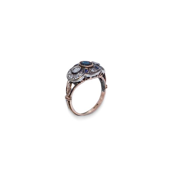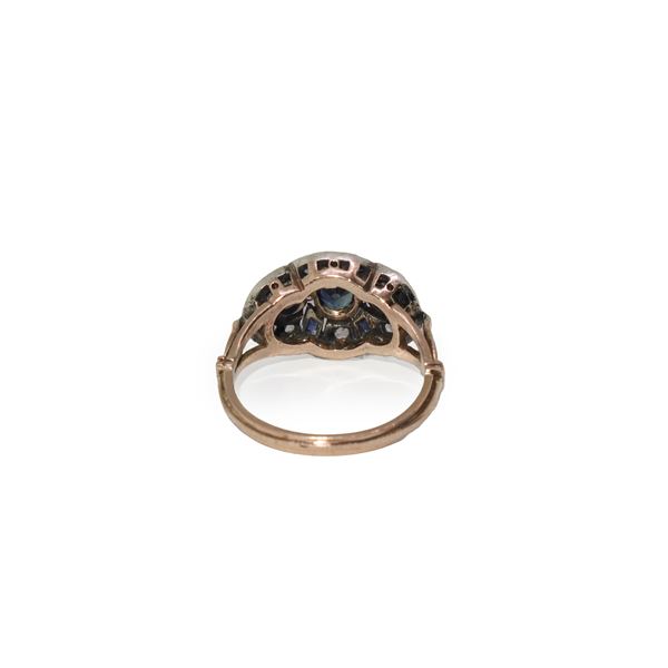 Anello liberty in oro, coppella, zaffiro centrale, piccolo zaffiri e diamanti