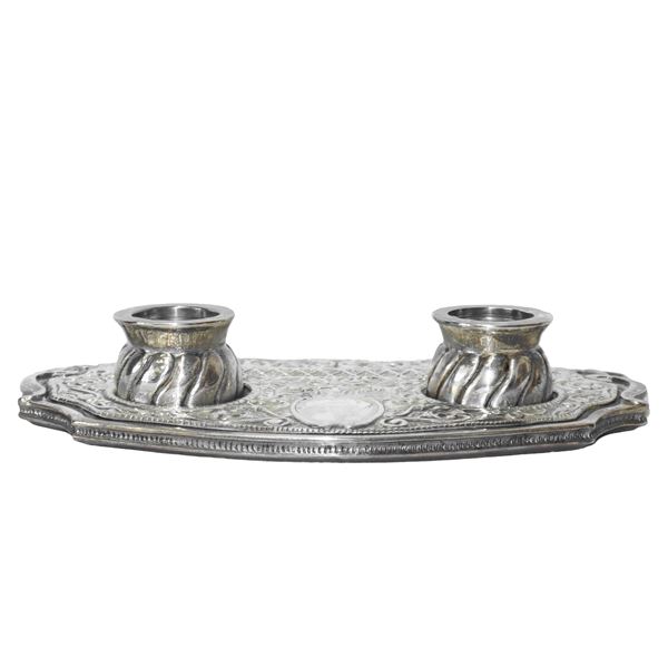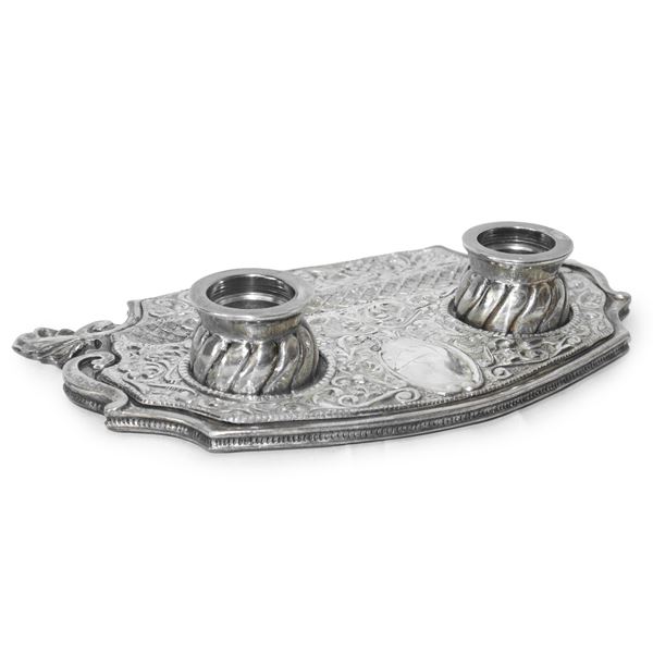 Calamaio in metallo con piastra in argento cesellato, XX secolo