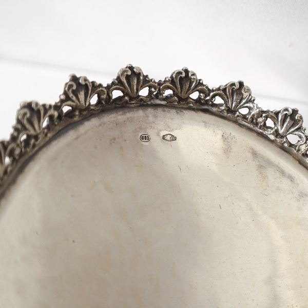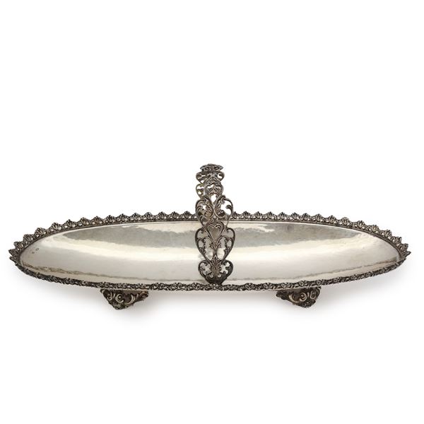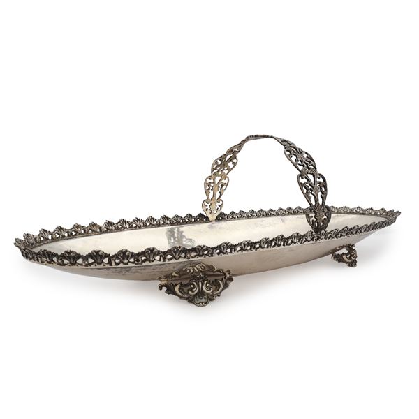 Portadolci con manico di forma ovale e bordo a ringhiera con foglia d'acanto