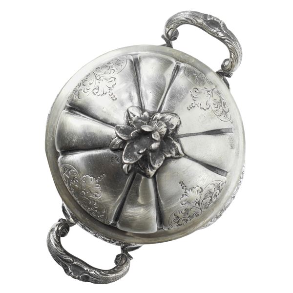 Servizio in argento con decoro sbalzato a lobi composto da caffettiera, lattiera, zuccheriera e teiera