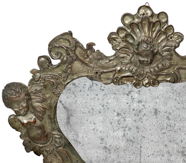 Metallo sbalzato con puttini e stilemi a rocaille