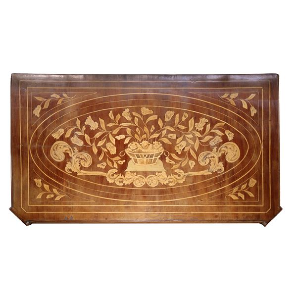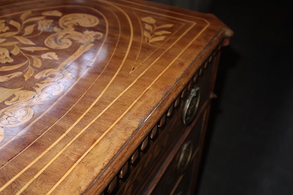 Cassettiera in legno di mogano intarsi in legni chiari a motivi floreali, Olanda, fine XIX secolo