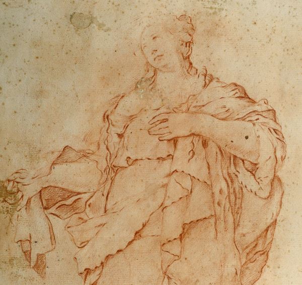 E proprio il confronto con le due Allegorie della Salubrità e dell’Abbondanza scolpite, intorno al 1760, sul fronte della Fontana di Trevi dal della Valle, induce a considerare questo disegno qui in esame come uno studio elaborato dal Maestro per una grande statua allegorica di analoga impostazione ed esattamente nello stesso momento in cui mise mano ai progetti per quelle due statue mirabili per la Fontana di Trevi. La finezza del tratto e l’armoniosa complessità del panneggio conferiscono a questa immagine quella tipica movenza barocca che Filippo della Valle esprime senza alcuna tentazione di retorica o, peggio, fatuità, mantenendosi invece sobrio e vigilato. Questo disegno è di nobilissima espressione e la perfetta conservazione contribuisce e renderlo quanto mai affascinante.