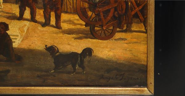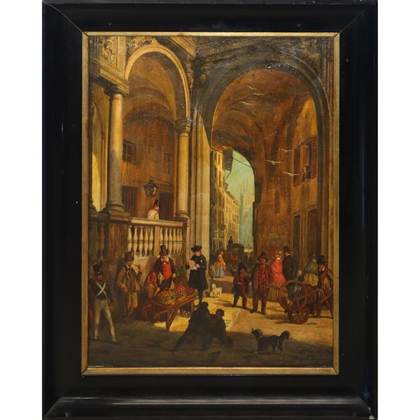 "Il finissimo dipinto è firmato da Angelo Inganni ed è una tipica opera del suo periodo tardo, eseguita cioè nel corso dell'ottavo decennio del secolo diciannovesimo, quando il maestro, dopo varie e interessanti vicende sviluppatesi tra Milano e Vienna, si dedicò con grande impegno e fervore alla rappresentazione della vita quotidiana in città, con un felicissimo senso della prospettiva e con una magnifica attitudine verso la pittura narrativa gremita di figurine sempre fortemente caratterizzate, disseminando i suoi quadri di aneddoti ed episodi di ogni genere che rendono come meglio non si potrebbe il tumulto di una vita vivacissima e brulicante.