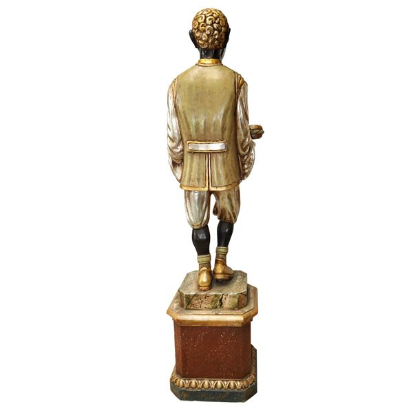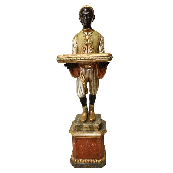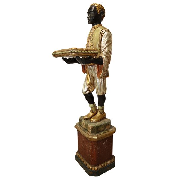 Moro veneziano con vassoio in legno policromo su base a plinto, Fine XIX secolo