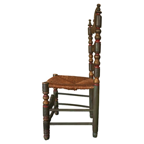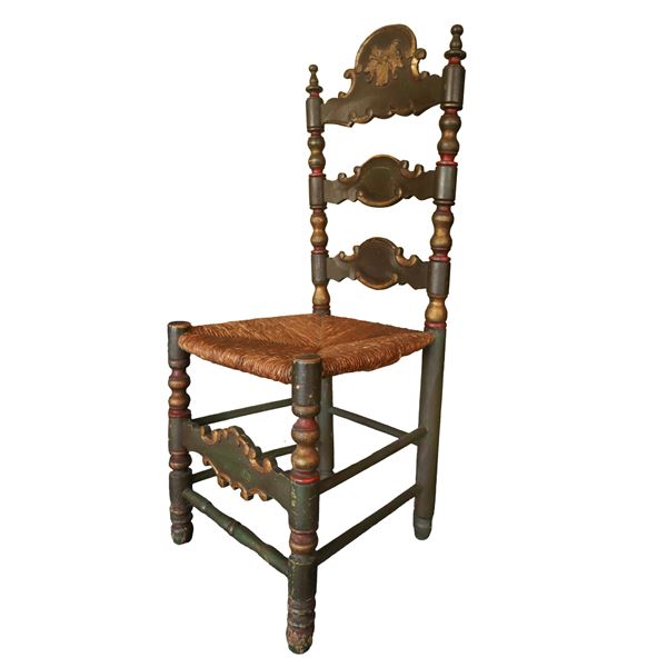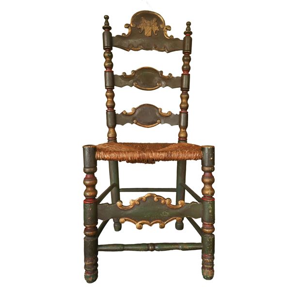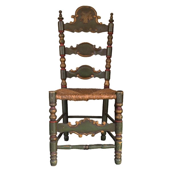 N. 4 seggioloni in legno laccato verde e oro con stemma, Inizi XX secolo