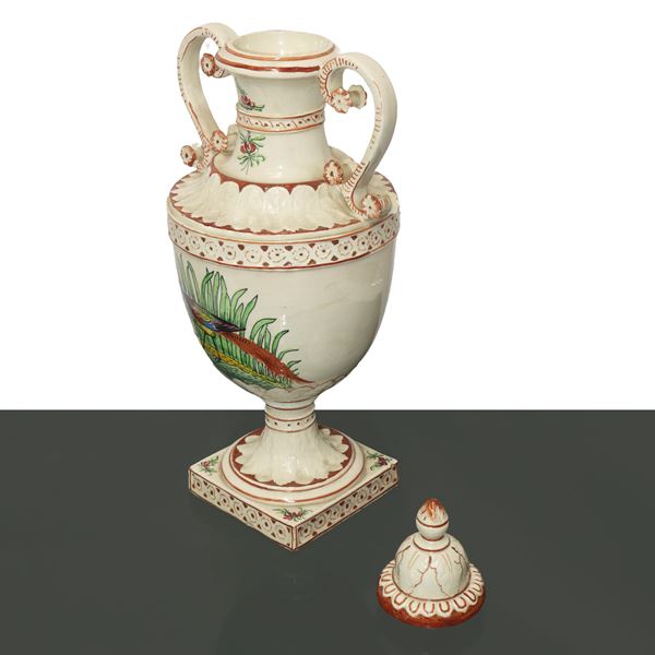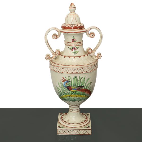 Potiche in ceramica veneta decorata a motivi settecenteschi e dipinta con Uccello del paradiso su ambo i lati, Nove di Bassano, Fine XIX secolo