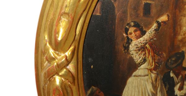 Firmato in basso a destra con dicitura "Sevilla". Sul retro timbro della Galleria de Arte Mena de Peralta (Malaga). Già in asta Sala Retiro stima € 7500.