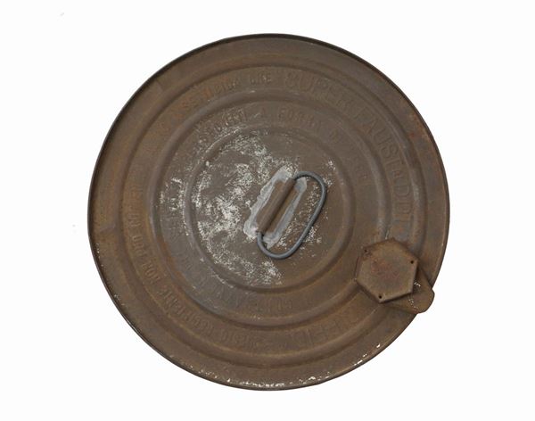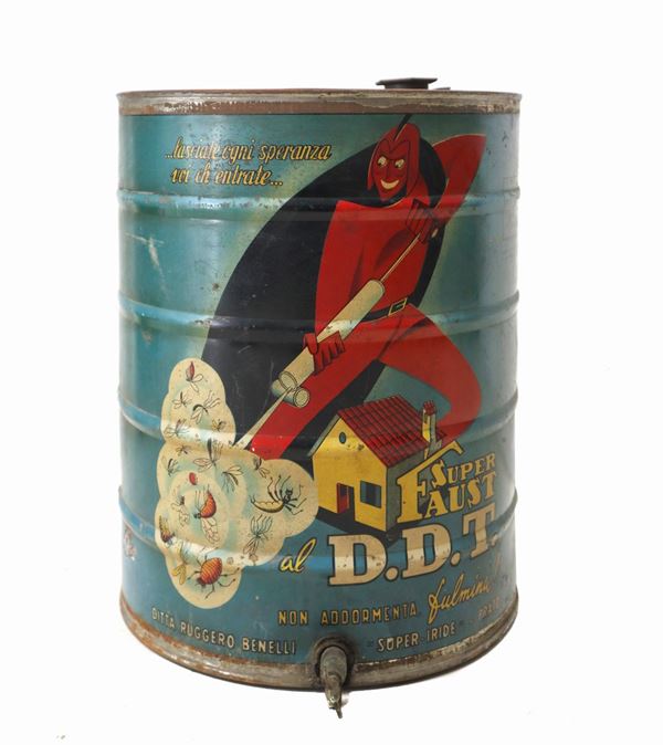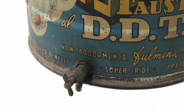 Tanica in latta, serigrafata. Con rubinetto in ottone, presenti normali segni d'uso
