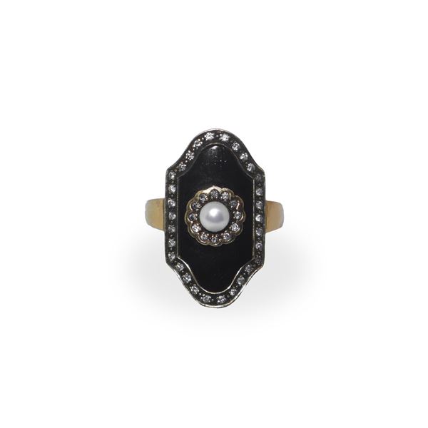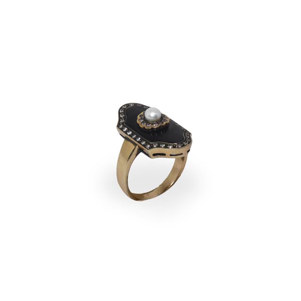 Anello in oro 14 kt con onice, perla centrale e scaglie di brillanti al contorno