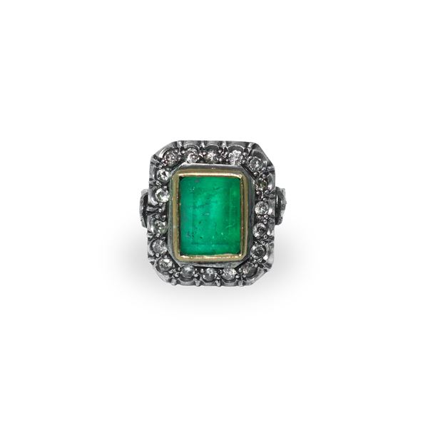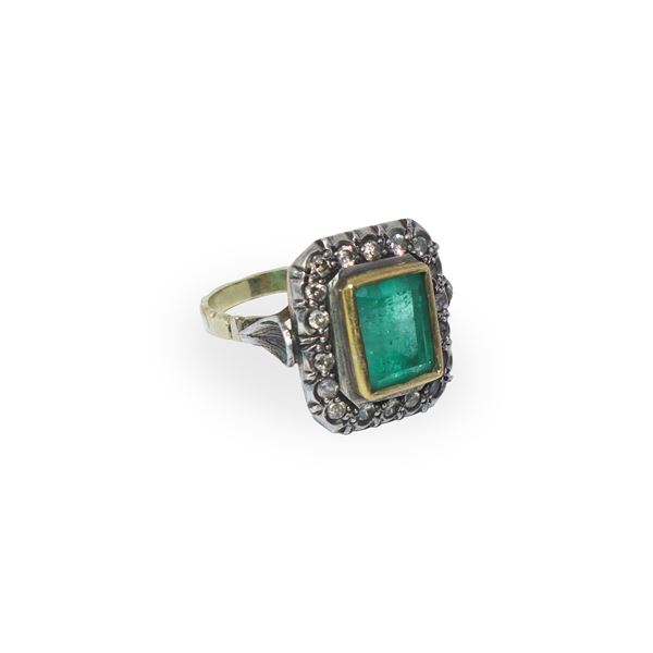 Anello in oro basso titolo e argento con smeraldo e ghiera di brillanti