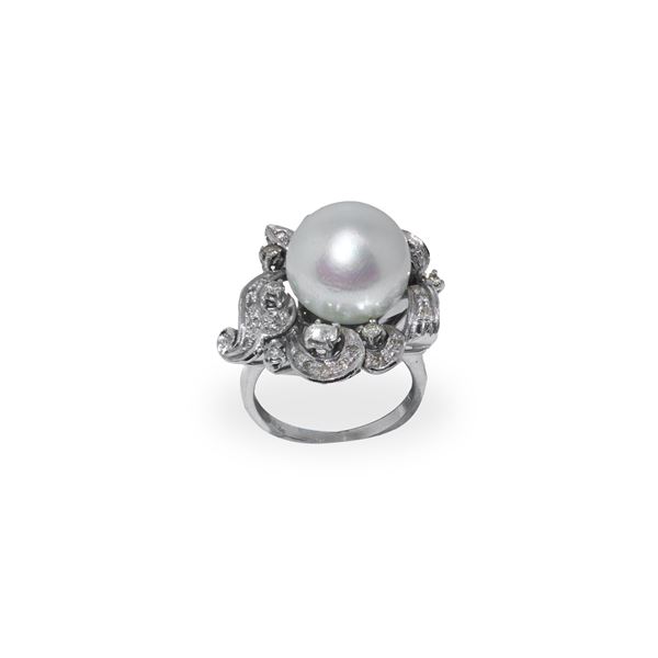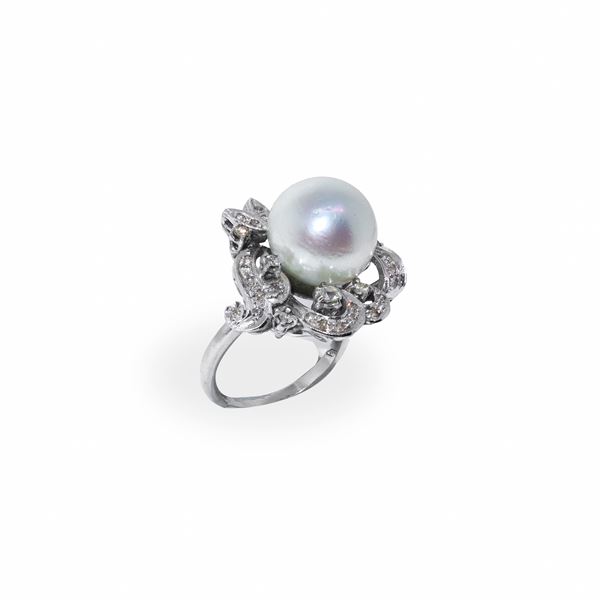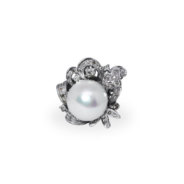 Anello in oro bianco 14 kt , diamanti taglio brillante e perla centrale