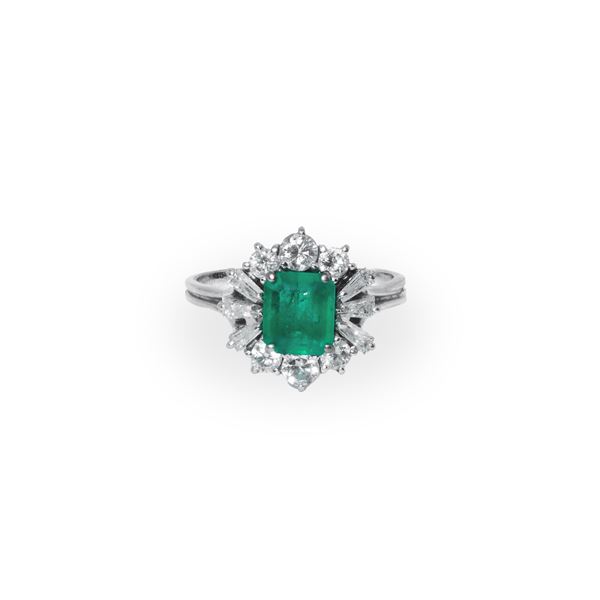Anello in oro bianco 750 con smeraldo centrale e ghiera di diamanti taglio tepper