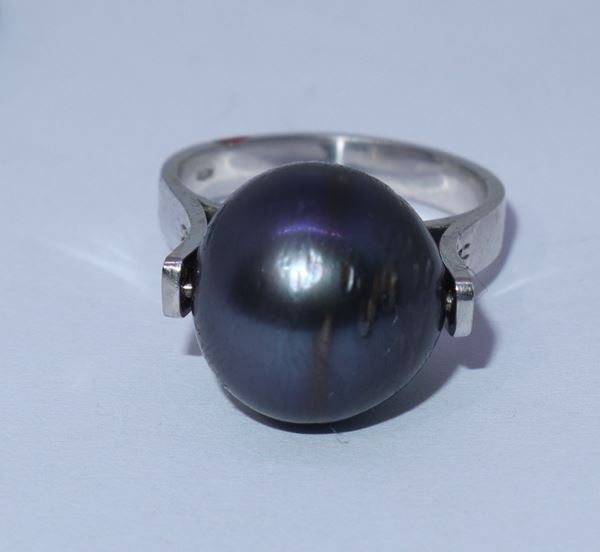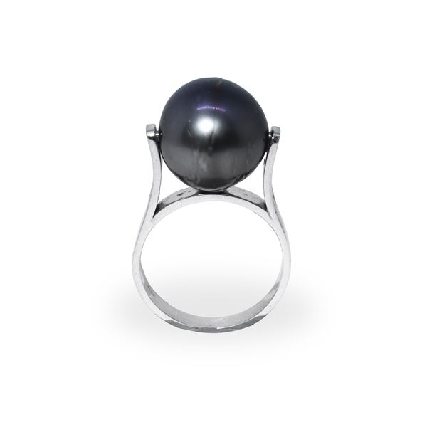 Anello in oro bianco con perla grigia e file di brillantini ai lati della perla