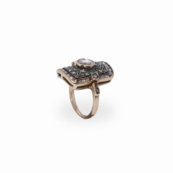 Anello in oro kt e argento con diamanti di forma rettangolare con diamanti taglio brillante e diamante centrale