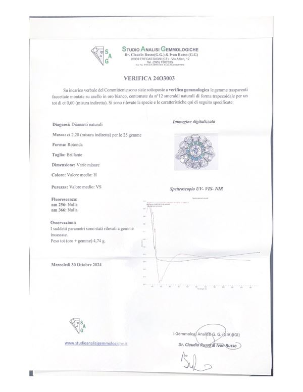 Analisi gemmologica: diamanti naturali di forma rotonda taglio brillante. Pietre di varie dimensioni, colore valore medio H purezza valore medio VS. I parametri sono stati rilevati a gemme incassate
