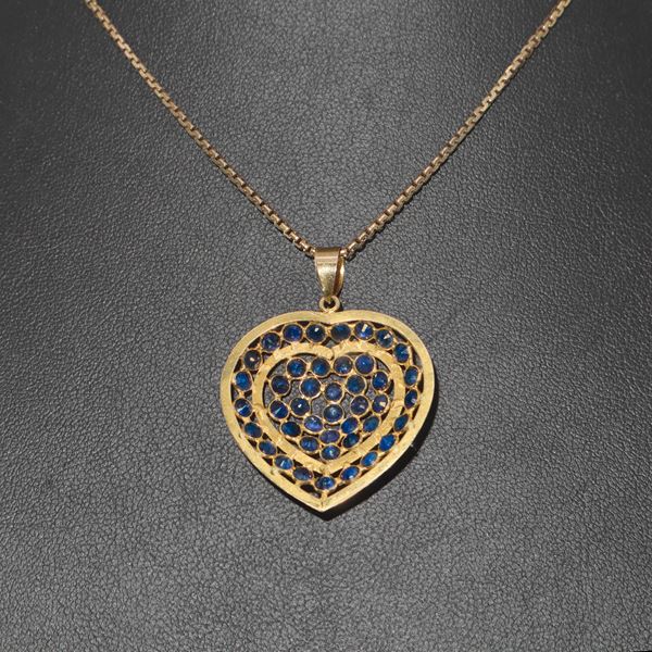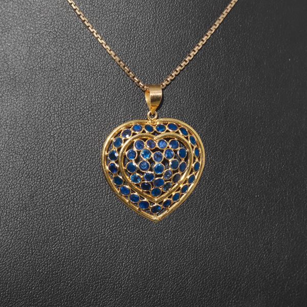 Ciondolo a cuore in oro giallo 18 kt e zaffiri con collana in oro.