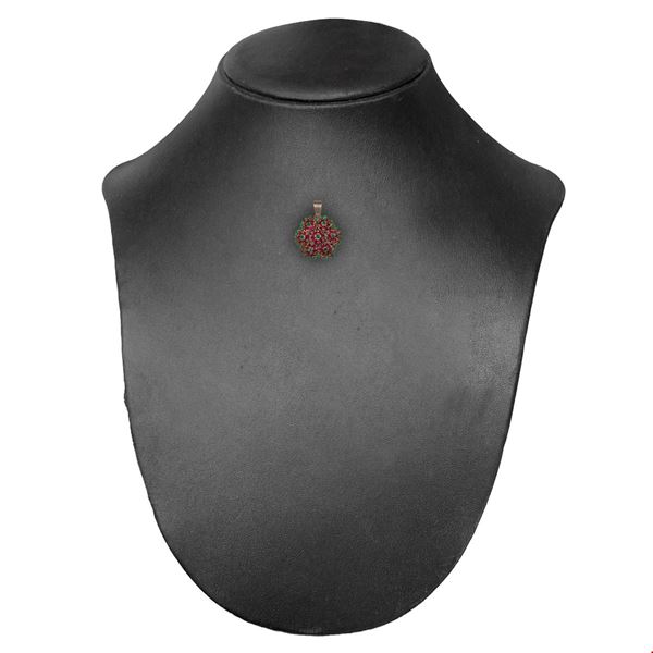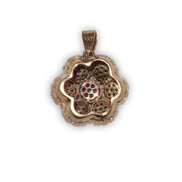 Ciondolo in oro giallo a forma di fiore con smeraldi e rubini