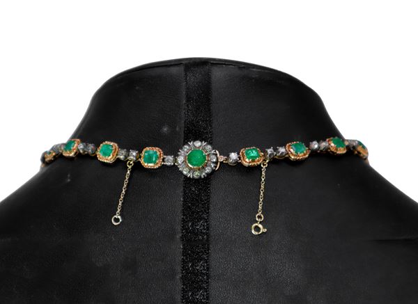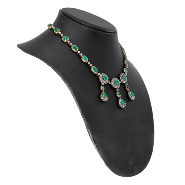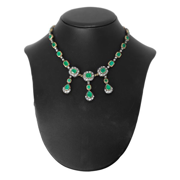 Collier d'epoca in oro a basso titolo e argento con diamanti e smeraldi