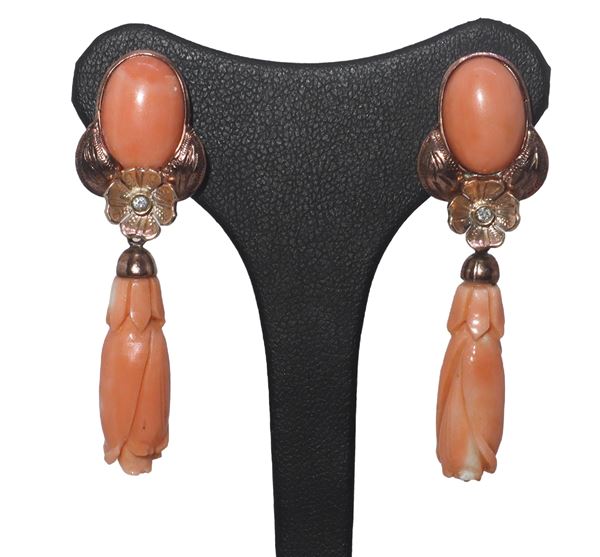 Orecchini a clip pendenti in oro a basso titolo e corallo rosa a fiore
