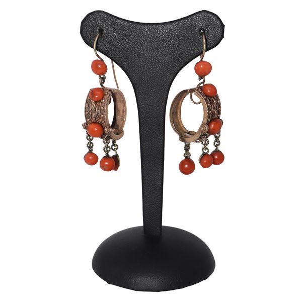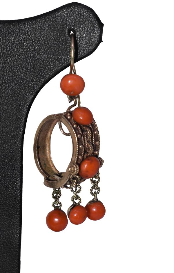 Orecchini con pendente a boccolo in oro giallo a basso titolo e corallo