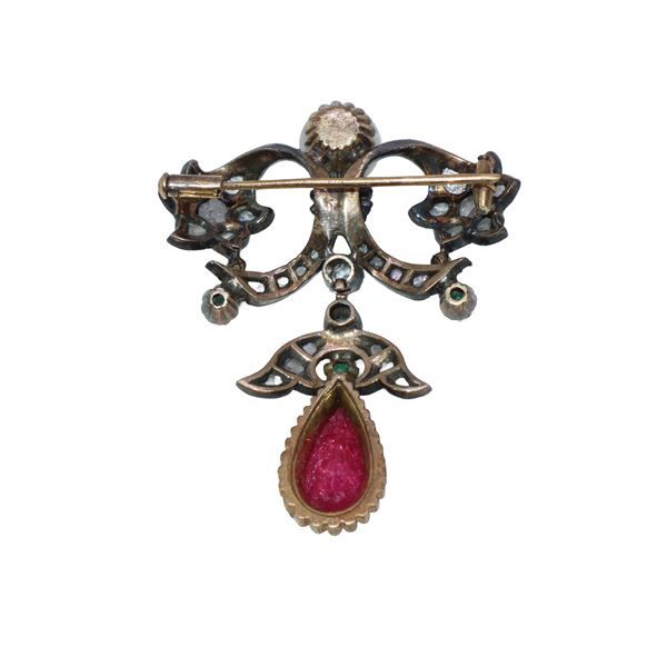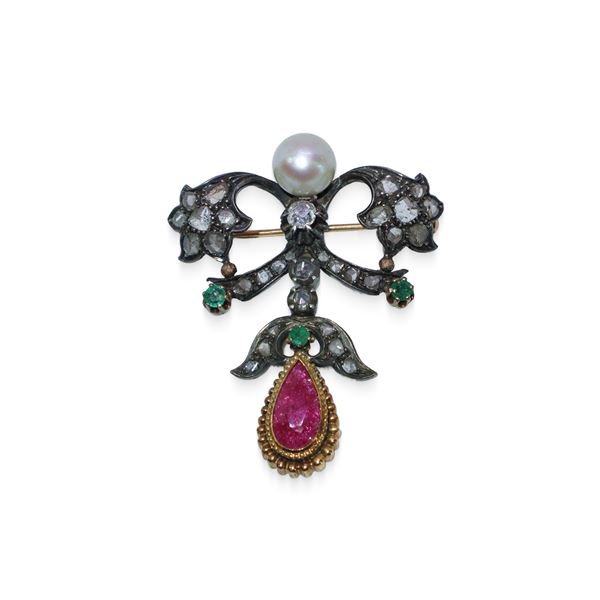 Spilla con perla, diamanti, smeraldi e rubino a goccia