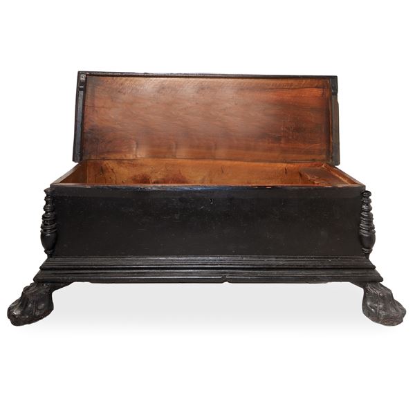 Cassapanca in legno di noce con piedi leonini dentellatura al sottopiano e colonne a rocchetto ai lati, XVII secolo