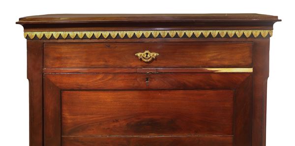 Parte superiore con calatoia ad uso scrittoio. In testa decorazioni a foglie lanceolate dorate a mecca. Interno con cassetti. Parte inferiore presenti n° 3 cassetti, ai lati colonne ebanizzate nere e capitelli a base dorata a mecca. Piede tronco-piramidale.
