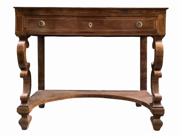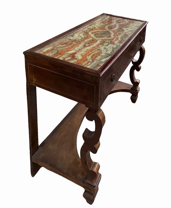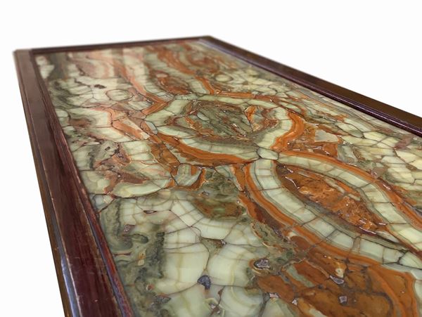 Marmo al piano lumachino di Cefalù giallo e verde, cassetto sottopiano e filettature su tutti i bordi in legno chiaro. Provenienza Sicilia.