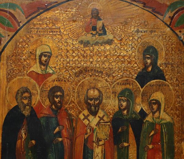 Icona russa Cristo Pantocratore con sette santi su fondo oro