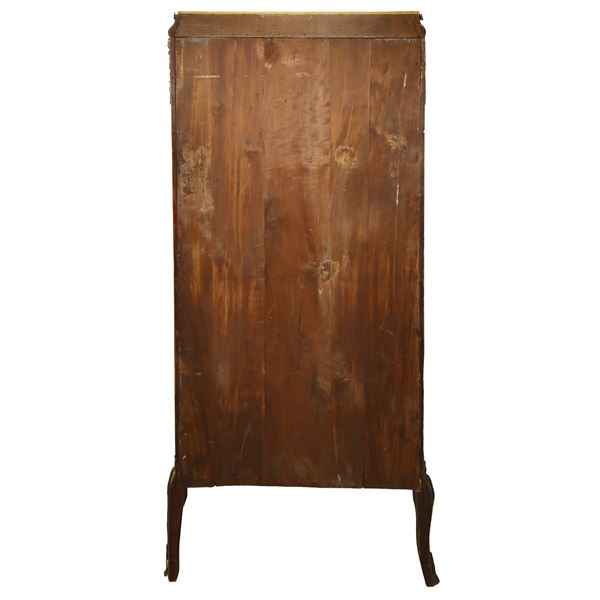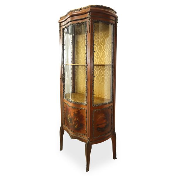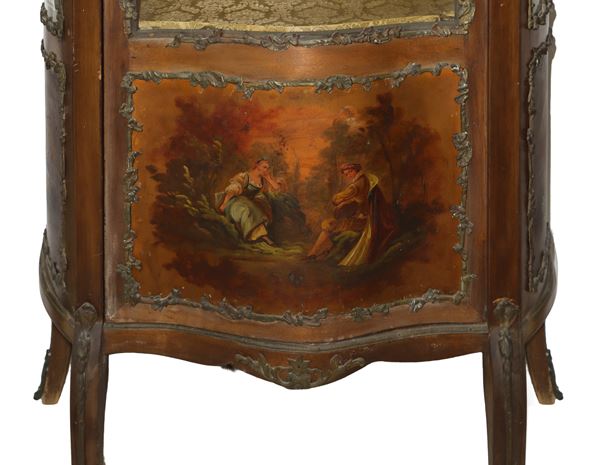 Vetrina Napoleone III in legno di noce con vetri bombati con anta centrale bronzi applicati e parte inferiore dipinta con scene galanti, fine XIX secolo