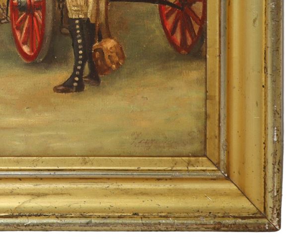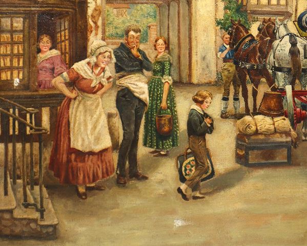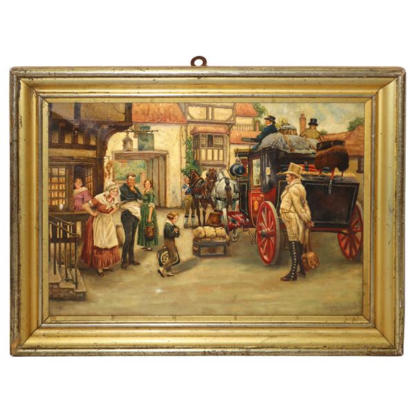 Scena di paese con carrozza e personaggi