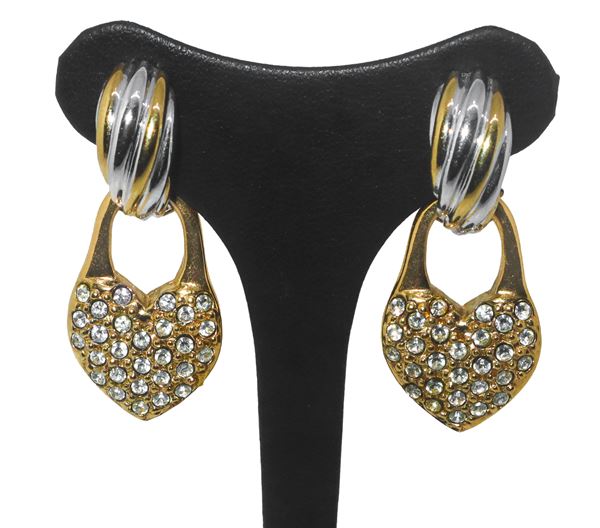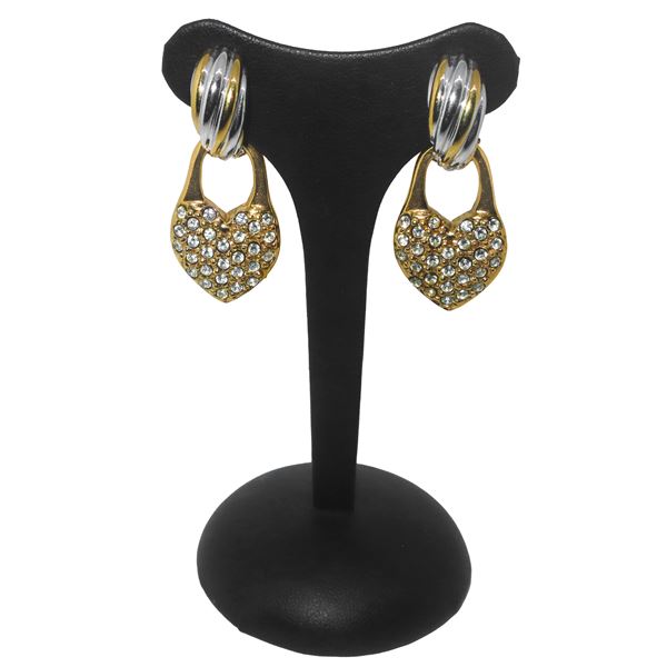 Orecchini pendenti a clip con cuore con stras e gioco di colori dorato e argentato