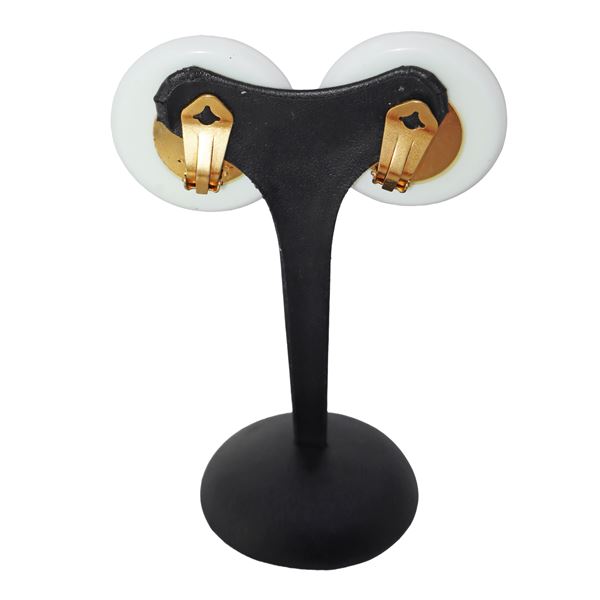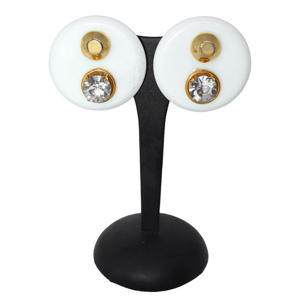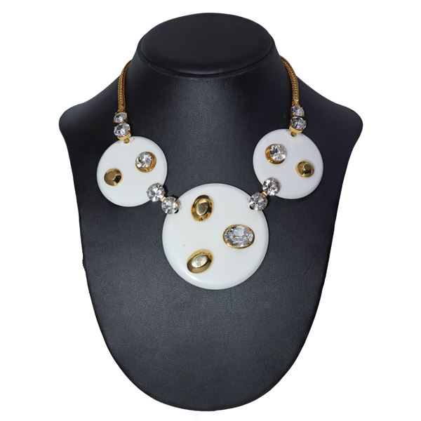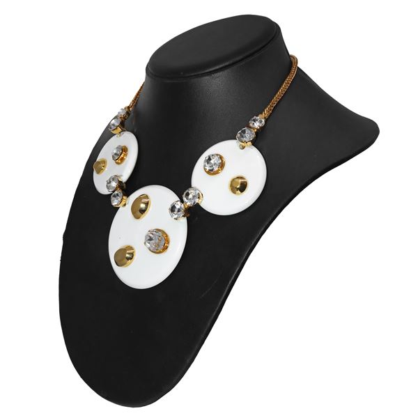 Parure di collana e orecchini a clip vintage con strass e placche dorate su cerchi bianchi, anni '80